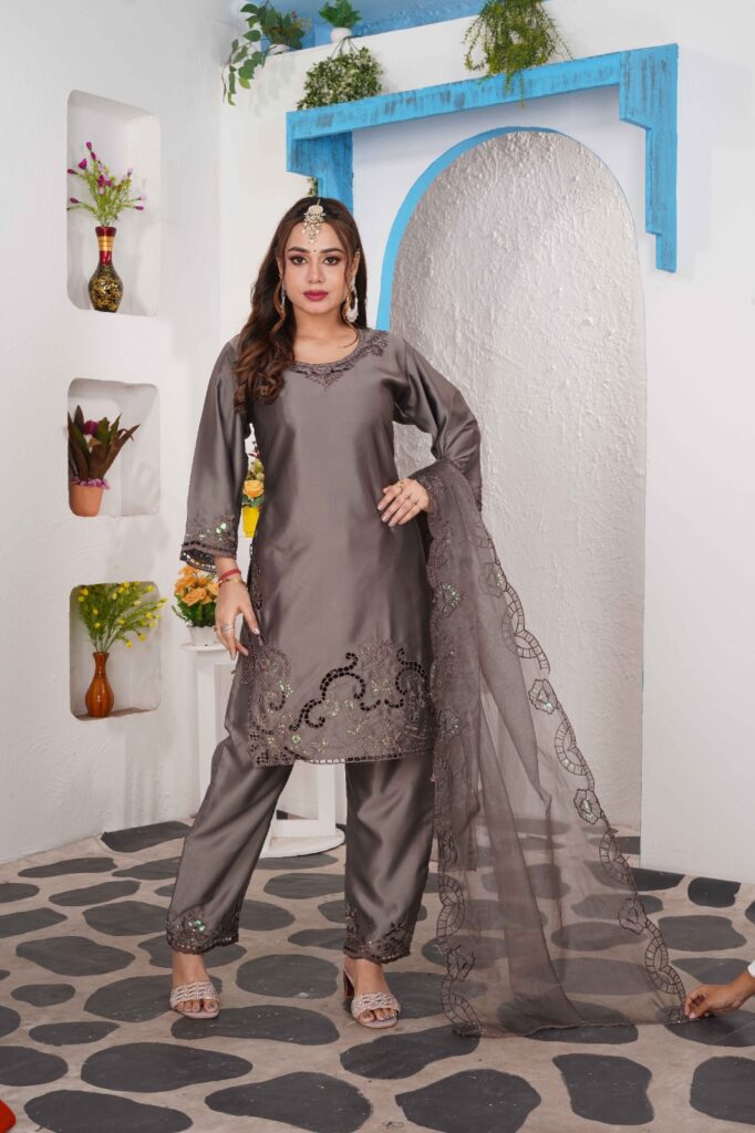 Elegant grey co-ord set crafted in soft fabric, highlighted with delicate embroidery on the kurta, pants, and dupatta. A refined choice for festive evenings and party wear.