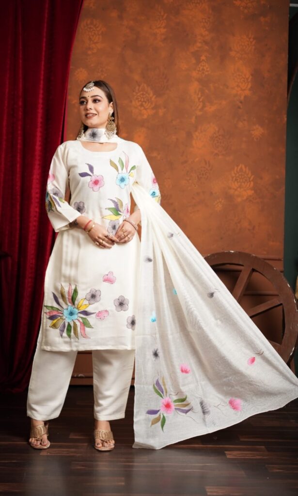 Graceful white floral embroidered 3-piece set with multicolor thread work and lightweight dupatta for an elegant and fresh look.